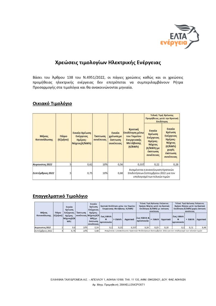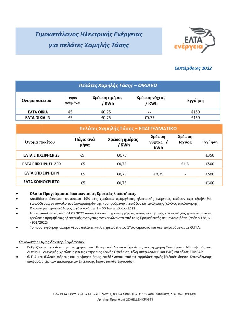 Νέος τιμοκατάλογος υπηρεσιών ΕΛΤΑ Ενέργεια από 1 – 30 Σεπτεμβρίου 2022